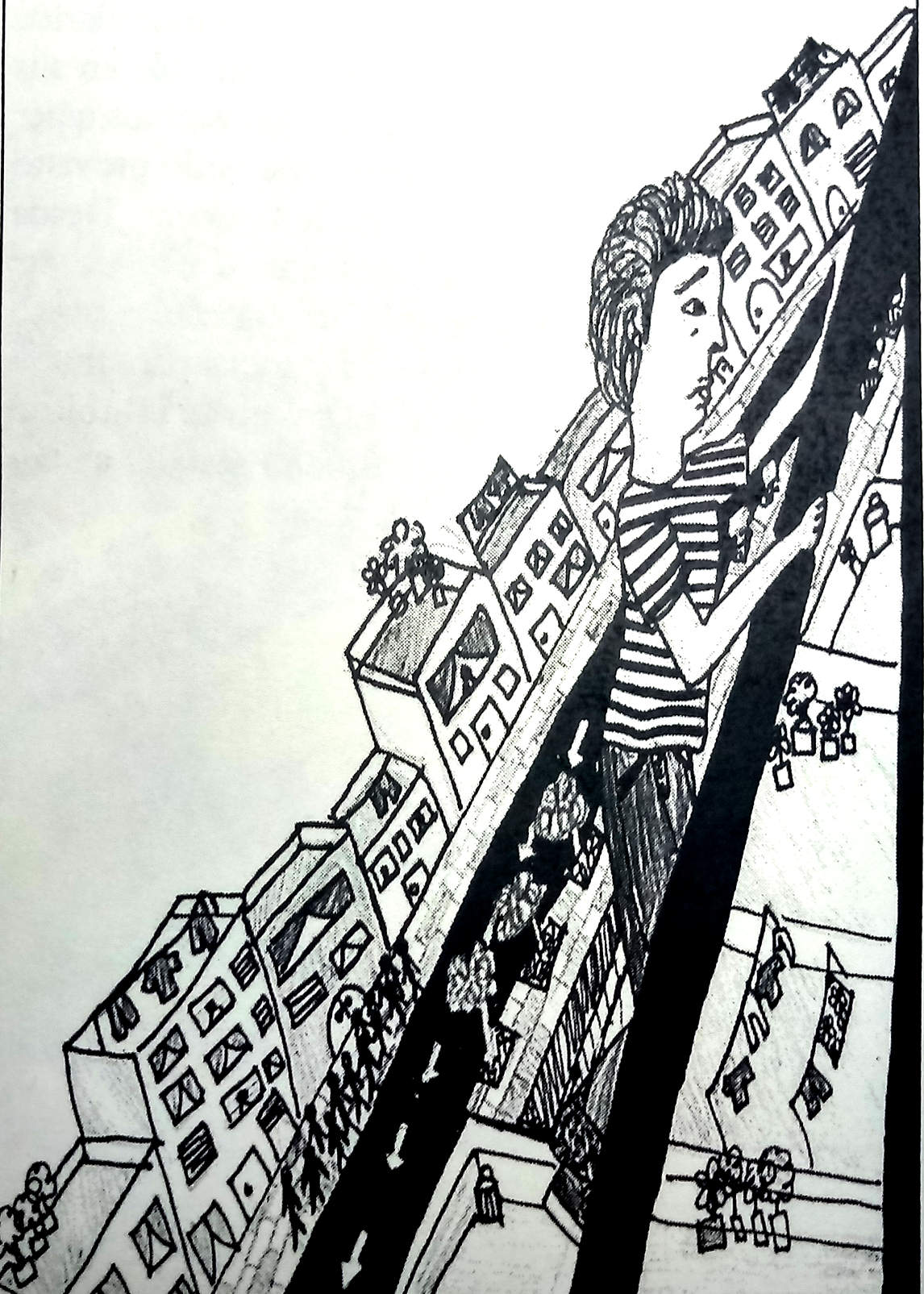 Oloviniek estaba por bajar la persiana de su ferretería cuando advirtió que en la vereda el extraterrestre miraba hacia la punta de la antena de telecomunicaciones. Habiendo visto elefantes rosados, ver a una persona mirar hacia arriba no lo distrajo de su rutina; pero el tiempo es lo que duran las cosas sujetas a cambio y, en menos que canta un gallo, el extraterrestre comenzó a subir los peldaños de la torre. Oloviniek salió justo en el momento en que un grupo de skaters se detenía y observaba la escena. Los vecinos uno a uno fueron abriendo las puertas de sus casas. (La curiosidad es como el universo, no tiene límites). En medio del tumulto aparecieron dos oficiales de policía: “No vayas a cometer ninguna locura, nosotros podemos ayudarte”. El extraterrestre continuó su ascenso hasta que desde el murmullo generalizado una voz se alzó sobre las demás: «¡Hijo, bajá!… por favor te lo pido, bajá». Por un instante todos la miramos. “No mamá. Acá nadie me quiere”. Después ya no se detuvo. Cuando llegó a lo más alto algunos curiosos le pedían que se tire.